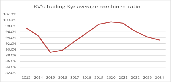 Over the last decade, Traveler’s gross written premiums (GWP) grew by roughly 5% per year, in line with the growth of the overall P&C market. Underlying profitability also remained roughly the same, with the combined ratio, a key measure of insurance company profitability, fluctuating between 90% and 100% for most years.